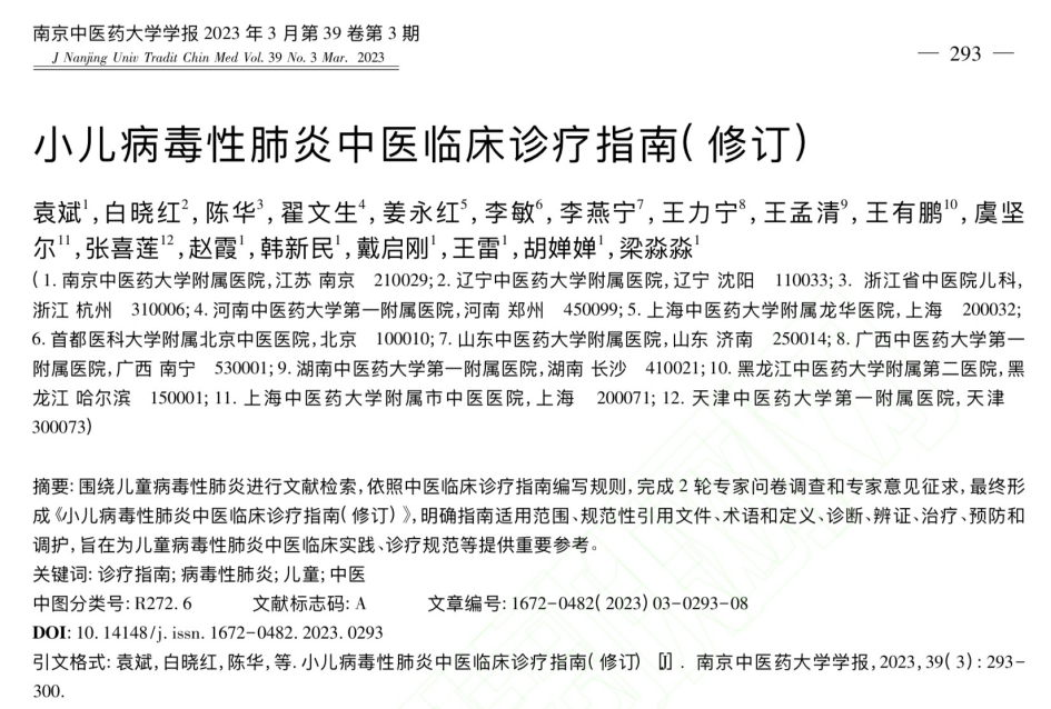 • 为了进一步规范儿童病毒性肺炎的诊治,2011年由汪受传、陈争光、徐珊等在文献研究和专家意见集成的基础上制定的《小儿病毒性肺炎中医诊疗指南》发布。近10年来,随着中医学和现代医学的发展与相互交流渗透,有关儿童病毒性肺炎的疾病特征、治疗方法、药物研究、预防调护等相关文献大量涌现,为儿童病毒性肺炎的临床诊疗提供了新思路、新方法,因此,中华中医药学会儿科分会委员、南京中医药大学附属医院儿科主任袁斌教授牵头,通过文献检索、专家问卷调查及专家意见征求等研究方法,对《小儿病毒性肺炎中医临床诊疗指南》进行修订更新,最终完成了《小儿病毒性肺炎中医临床诊疗指南(修订)》,并于2023年3月发布。