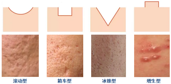 其中,80%的痤疮瘢痕为萎缩性,萎缩性瘢痕又进一步分为冰锥型瘢痕、箱车型瘢痕及滚动型瘢痕(图2)。